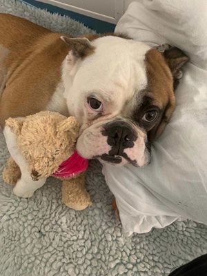 Ronnie is a one year old Bulldog cross. He was fit and healthy until he collapsed within minutes of vomiting a large amount of food and rubber bits on a Sunday evening. Earlier that day, Ronnie had been chewing on a football and the rubber bits were part of this football. He was rushed to the Southampton Vetsnow practice, where he was diagnosed with a haemo-abdomen. He was treated supportively with boluses of fluid and referred on the Monday to SCVS for further investigations.