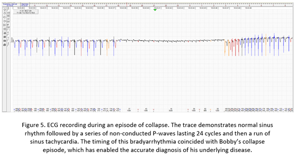 An echocardiogram (heart scan) did not reveal any structural or functional cardiac abnormalities. Paper-trace ECG showed no evidence of cardiac arrhythmias during a 5-minute recording, but transient arrhythmias could not be excluded. Consequently, Bobby was fitted with an ambulatory Holter ECG monitor and sent home the same day.