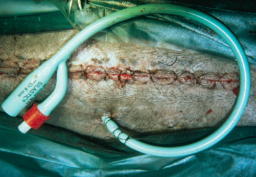 Briefly, the procedure for placement is as follows; the patient is anaesthetised and placed in dorsal recumbence. The ventral abdomen is clipped and aseptically prepared. An over-the-needle catheter is placed percutaneously into the bladder. A guide-wire is inserted into the bladder, through the catheter and the catheter is then removed. A graduated, peel-away dilator / introducer is inserted through the body wall and into the bladder lumen over the guide-wire. The guide-wire is removed and the low-profile cystostomy tube is insert via the peel-away introducer and held in place by inflation of a small balloon within the bladder lumen. The patient is recovered and hospitalised for at least 24 hours to allow initial seal formation around the stoma site.